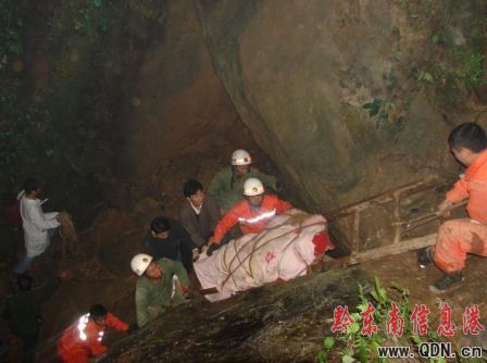臨時搶險救援組立即增援力量,派2名戰斗員帶上呼吸保護器材趕撲現場。二是現場戰斗人員分成兩個戰斗小組,第一小組由周顯中帶隊,帶兩名戰斗員進洞救人,第二戰斗小組等待2次救人。第一小組到事故點后,一人進洞底,兩人在洞口,利用救生繩,在被困人員身上系好繩索,采取上拉下推的方法救人,但洞口太小,在S型中間被卡住,多次不能拉出,這時周顯中的空氣呼吸器報警,被迫撤離。由于洞內復雜,空氣呼吸器不足,指揮部立即決定一邊利用現有人員、器材繼續救援,一邊向支隊指揮中心報告現場救援情況并請求增援。第二次進入洞內時,三人在上面拉,一名體力好的戰斗員攜掉防護裝備下到洞底,采取同樣的方法,經多次努力,終于從垂直向下成S型小洞口將一名被困人員拖到約8米左右的地方,經過現場醫務人員搶救、診斷,確認有微弱體溫的被救出人員已經死亡。由于作業人員在洞內作業時吸入部分一氧化碳和氧氣稀薄的原因,戰斗人員感覺到頭暈眼花,四肢無力,被迫再一次撤離。經醫務人員檢查,確認兩名被困人員已經死亡,指揮部決定適時的休整片刻,采取移位式的方法,求援隊伍輪換上陣,拖幾米至十幾米,上一組感覺身體不行就出到第二洞口休息,換上另一組,這樣連續作戰接近十六個小時,終于把兩名被困人員的尸體拖出溶洞。