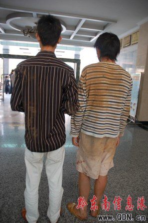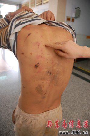 事后,記者在黔東南州醫(yī)院見到了兩名遭挾持男子,兩人身上被刀刺、煙頭燙的痕跡觸目驚心,其中一人身上被燙了近百個疤痕和水泡。