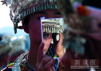 11月12日苗年節的第3天,得知郎德上寨有古歌對唱表演,我清早就駕車從縣城出發。離郎德上寨還有3公里左右時,一位身著盛裝沿路邊疾走的苗家女孩告訴我自己正忙著去為好友送嫁。我立即改變原定采訪計劃,同這位叫小楠的姑娘一起參加婚禮。路上小楠告訴我,新人對外鄉人去參加婚禮一定會很高興,就是希望在拍照前征求他們的意見。