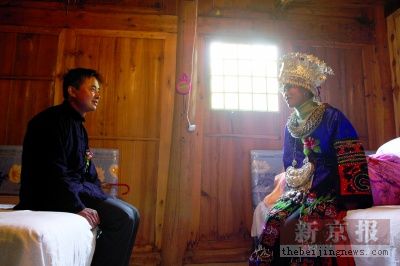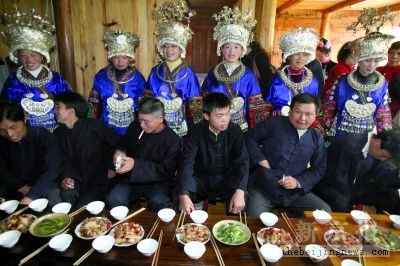 在苗族婚禮上,伴娘和新娘是一樣的盛裝;在新娘的家中,新郎在喝了攔路酒和進門酒后,滿臉通紅對著新娘傻笑;屋外,伴娘們和迎親的小伙子們正要展開一對一的喝酒競賽。
