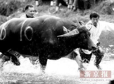 嫩牛組的比賽往往要激烈許多,這些初出道的斗牛有著老子天下第一的氣概。有時兩頭斗牛進場后,相隔數十米雙方都向對方全力沖撞過去,這次比賽就出現了這樣的情況,一頭嫩牛被當場撞死。嫩牛開始斗以后不容易認輸,兩頭牛不管誰強誰弱都會力爭拼下去,不少比賽都是等到時間到了兩頭牛還在斗得難解難分,工作人員只好用大繩分別套住斗牛的后腿將它們分開。所以?炊放5娜硕颊f看嫩牛組比老牛組好看。一個崇拜牛的民族