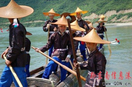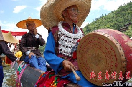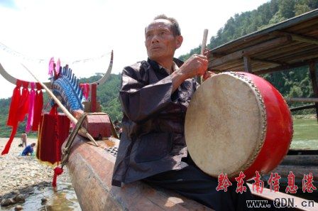 圖:頭戴斗笠的劃手和鼓手站在獨木龍舟競渡