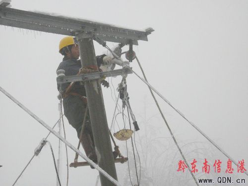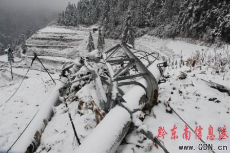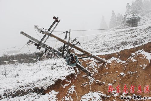 從元旦開始,黔東南州因受北方冷空氣流影響,氣溫持續在0——1攝氏度,在海拔1200米以上的地方出現嚴重的冰雪凝凍,凱里供電局供電轄區的雷山、從江、錦屏、三穗、黎平多條線路遭受冰雪襲擊,造成線路多次跳閘,多處倒桿、斷線,電網結構遭到破壞,電網安全受到威脅,受災損失嚴重。