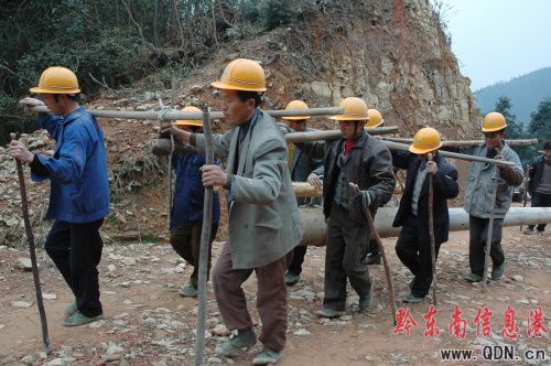 20日清晨7點,黎平縣孟彥供電所里僅一人留守,組成了一支搶險隊分頭行動,迅速奔赴在各個事故地點。竹山村是大稼鄉最偏僻受災情況最嚴重的一個村。群峰疊嶂的山區里天氣變化無常,一會兒大霧彌漫,一會兒陰雨綿綿。因為該村剛修建鄉村公路,搶修車輛無法前進,職工肩挑背扛,臉龐流下的已分不清是汗水還是雨水,一步一滑地向搶修點走去。由于冰覆,無法登桿作業,搶修職工們在百姓家中借來木梯,借助木梯艱難地爬上電桿作業,用稻草燃燒把電桿覆冰融化,不停地忙碌著。渴了就隨手折一支冰枝放入口中吮吸,滿身的泥倒像穿了一件迷彩服。聞訊趕來的百姓們扛著篇擔紛紛加入到搶險隊伍,幫忙抬電桿。黃色、紅色的電工帽、黑色、白色的頭巾交織在一起,相互攙扶著。