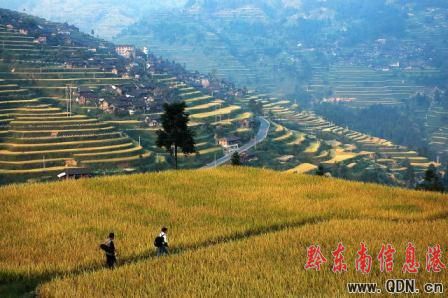 9月23日攝影,金秋時節,位于苗嶺山脈的雷山縣開屯梯田,成片成熟的稻谷把雷公山山脈打扮得金浪翻滾,一派豐收的美景。當地苗族農民正抓緊時機搶收稻谷,確保顆粒歸倉。(特約記者 陳沛亮 攝影報道)