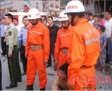 到達現場后,只見一男子身穿一條深藍色褲衩,坐于一棟正在施工的七層樓的屋檐上,情緒非常激動,隨時有跳樓的可能。當時在場圍觀的群眾很多,并不時發出起哄聲,如果再不及時將該男子救下,情況會變得更加惡劣。經過對現場仔細勘察后,榮風濤副大隊長立即對救援力量進行部署:一是由公安干警設立現場警戒,疏散現場圍觀人員;二是安排縣醫院急救醫護人員,進入現場警戒區,隨時準備實施救護;三是安排源江村村長與跳樓男子進行對話,希望能將其勸服下來;四是由中隊干部帶領三名經驗豐富的戰斗員爬上七樓,隱藏在該男子身后,看準時機將其“擒下”。時間一分一秒的過去,情況越來越危急,該男子雙腿伸出屋檐,隨時有可能跳下樓。就在這關鍵時刻,中隊三級士官劉進全同志急中生智,點了一支煙慢慢的遞給他,跳樓男子猶豫片刻伸手接住了煙,就在這一瞬間,劉進全一把抓住他的手,在其他救援人員的幫助下,將該男子拽了下來,輕生男子成功獲救。