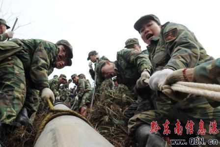 咬緊牙關,合力把水泥電桿拉上七十度的陡坡