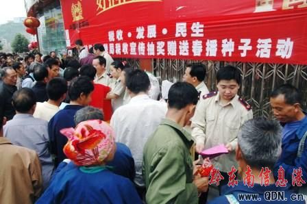本港訊 4月10日上午錦屏縣地方稅務局、縣遠程教育辦等8個單位30余人在縣城開展農村科技知識宣傳咨詢活動。當天上午為農民群眾發放科技資料12000份,贈送十七大精神講座光碟200張,贈送雜交水稻種子、玉米種子、蔬菜種子各100包,展出科普圖片230幅。圖為縣地稅局開展稅收宣傳贈送春播種子活動。(楊勝屏)