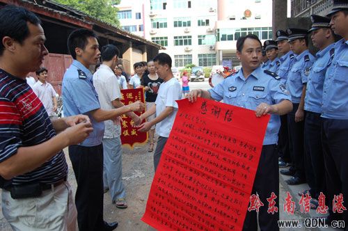 本港訊 (劉芳俊) 2008年7月30日上午9時許, 錦屏縣工商聯合會三江分會的40多名的個體工商戶,敲鑼打鼓將一張用大紅紙書寫的感謝信和一面寫有“巡警顯神威、盜賊遭震懾”的錦旗送到錦屏縣公安局交巡警大隊。