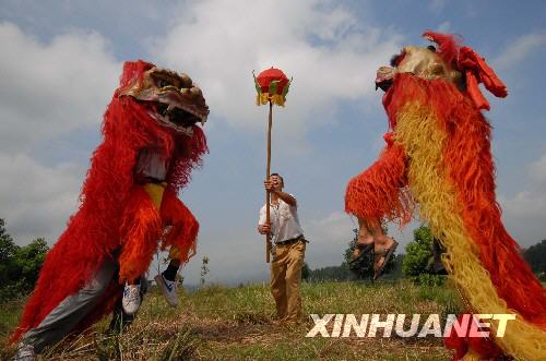 8月9日,村民在表演雙獅搶寶。 新華社發(fā)
