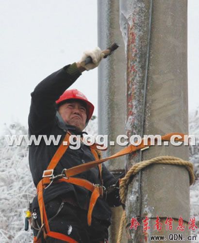 圖為搶修人員用鐵錘砸碎冰塊