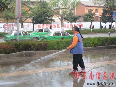 本港訊 (實(shí)習(xí)記者 孫玉霞) 4月15日,凱里市為迎接奧運(yùn)圣火的到來(lái),樹優(yōu)秀旅游城市形象,凱里市環(huán)衛(wèi)工人對(duì)城區(qū)的主要街道進(jìn)行了路面大清洗。他們用水沖洗路面的污垢,然后再用掃帚清掃。經(jīng)過(guò)環(huán)衛(wèi)工人的一番清掃后,凱里城區(qū)街道的面貌又煥然一新了。
