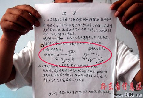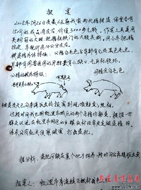另據辦案民警介紹,由于群眾飼養的生豬是他們主要經濟來源之一,故對自己飼養的豬兒“長相”倍加熟悉。在偵破此案期間,一失竊兩頭生豬的群眾給警方的一份報案材料上還特意繪了兩頭失竊生豬圖畫,并詳細標明毛色、斑點等體貌特征(見圖)等。這份圖文并茂材料被辦案民稱之為“史上最牛的報案材料”。