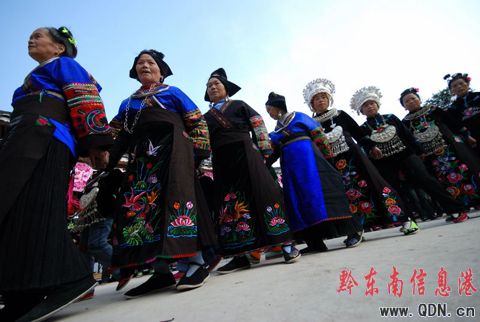 2008年11月25日,凱里市三棵樹鎮(zhèn)附近十村八寨的1000多名苗族同胞匯聚在老鴉村苗寨舉行民族銅鼓舞、蘆笙舞、對唱苗歌等豐富多彩的民俗活動歡送一年一度的苗年。(陳沛亮 攝影報道)