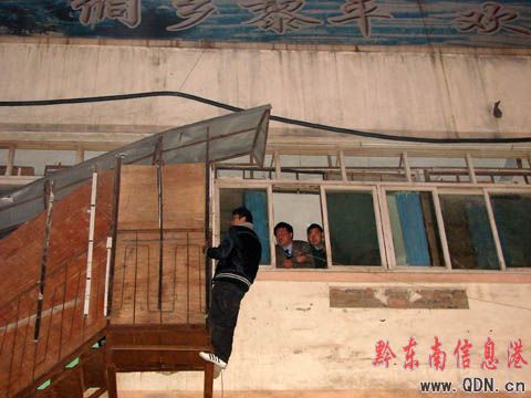 本港訊 2日晚,黔東南州黎平一名吸毒人員在逃避警方抓捕過程中,慌不擇路從三樓窗戶爬上樓梯外沿處,身處險境的他以死相要挾與警方對峙。當地消防隊員趕來后,經輪番勸說,男子這才自個兒爬回樓房內。