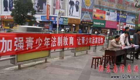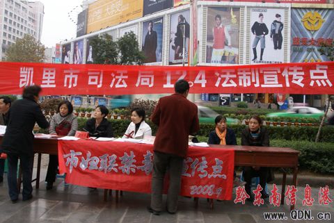 12月4日,凱里市大十字中心集中開展法制宣傳活動,設立宣傳咨詢點為群眾答疑解惑。司法局、州法治辦、州國稅局、州檢察院、州公安局、州林業局、市教育局、市禁毒辦、大十字街道、人事勞動和社會保障局等各部門的工作人員向市民發放各方面法律知識宣傳手冊,提高市民的法制觀念和依法自我保護的意識。為促進城市建設,構建社會主義和諧社會,營造良好的法制環境。(楊懿 攝影報道)