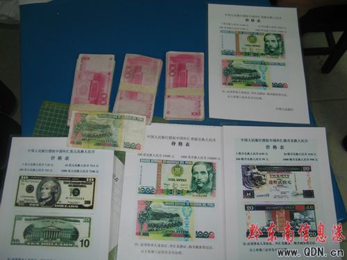 (圖為查獲該詐騙團伙用來詐騙的作案工具、外幣及假幣)