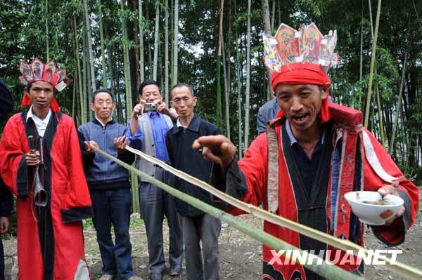 5月24日,貴州岑鞏民間儺戲藝人在竹林間進行儺戲表演。