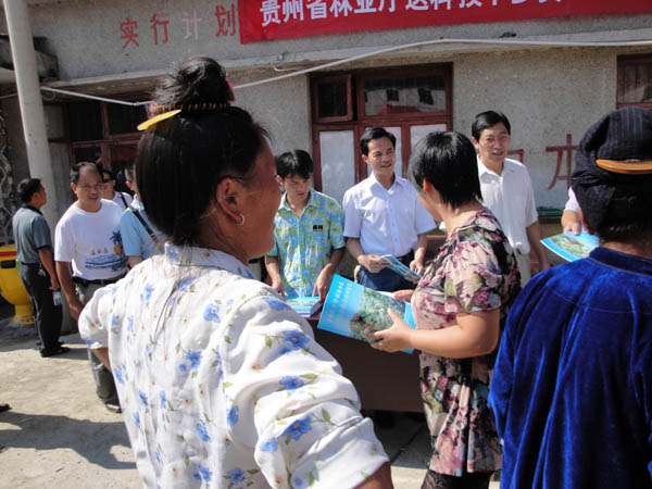 由省林業廳科技處、種苗與科技推廣站、天保辦、退耕辦等負責人及有關林業專家、技術員組成的送科技下鄉活動工作組一行20余人,在州林業局總工程師陳啟元等有關領導及縣林業局領導班子的陪同下,一大早從縣城出發,于上午10時許抵達南宮,與省駐南宮黨建扶貧隊隊員、省林業廳的科技處副處長康必光和派駐南宮掛職的省林業廳推廣站助理工程師羅輝同志會合一起開展活動。時值南宮趕集,工作組一下車,就到南宮鄉政府院壩開展現場送科技書活動,前來趕集群眾將省林業廳免費送的《退耕還林工程》、《貴州省無公害優質水果豐產栽培技術》、《林業重點工程培訓資料》等共1000余套冊適用林業技術科技書一“搶”而空。