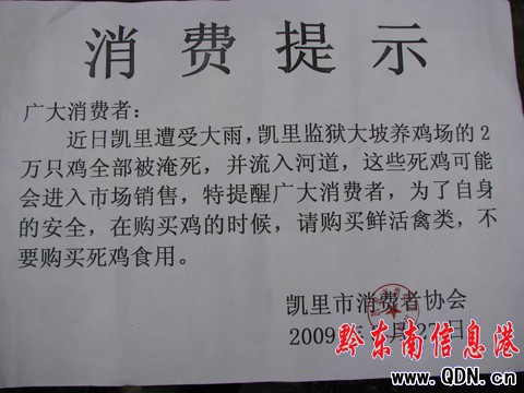本港訊 (本港特約記者 楊衛(wèi)中) 6月26日下午,凱里地區(qū)突降大雨,造成凱里監(jiān)獄大坡養(yǎng)雞場(chǎng)的2萬(wàn)只雞被淹死并被沖入河道中。事件發(fā)生后,凱里消協(xié)為避免這批死雞流入市場(chǎng),緊急下發(fā)消費(fèi)提示,要求市民買禽回家時(shí),暫不要買死雞。