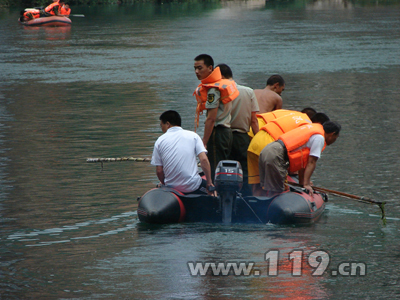 當了解到還有一名溺水者仍在水中時,消防指揮員立即協調縣水利局和武裝部派沖鋒舟進行增援。13時36分,三艘沖鋒舟到達現場,消防指揮員精心挑選三名水性較好的消防官兵登上沖鋒舟在河面上展開搜尋行動。同時,現場熱心群眾也參與到救援行動中,但因河水較深,且水草較多,給整個救援行動帶來很大困難,中途還因多次下大雨一度使打撈工作陷入停頓狀態。15時13分,消防官兵終于在第三次上船打撈過程中,利用消防火鉤順該男子最初溺水的位置順水流方向仔細搜尋的方法,發現溺水男子,并將其打撈出水。但由于溺水時間過長,該男子被打撈上岸時已經停止呼吸了。15時17分救援人員整理器材后撤離現場。