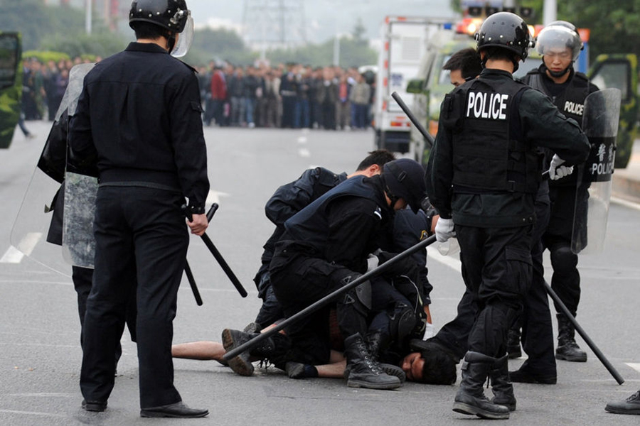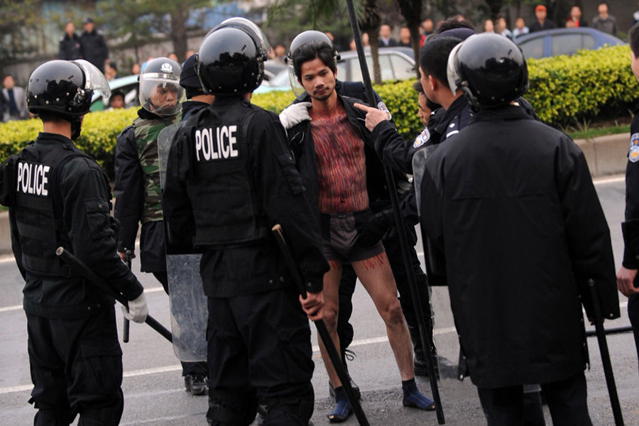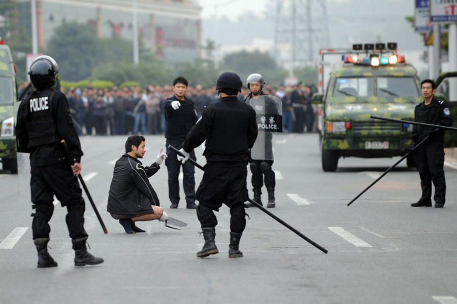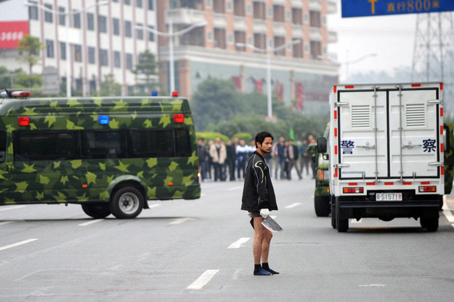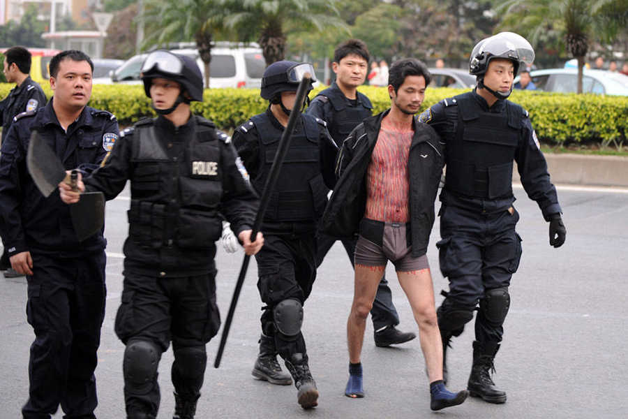 26日,廣東一黎姓男子在原公司索要工傷賠償被拒后,脫掉褲子提殺豬刀砍公司大門。他自稱“沒衣服、沒飯吃,就只能去偷去搶。并不是我不想做好人,是家庭環(huán)境、社會現(xiàn)實沒有給我機會”。