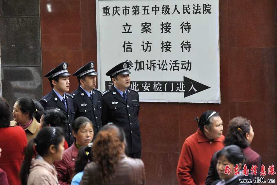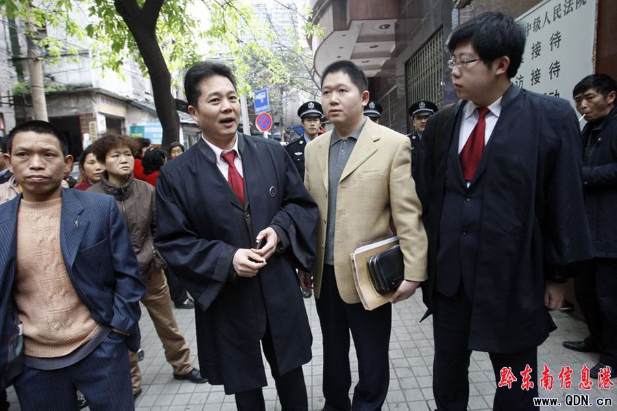 2010年4月14日,重慶市公安局原副局長、司法局原局長文強(qiáng)涉嫌犯包庇縱容黑社會性質(zhì)組織罪、受賄罪、巨額財(cái)產(chǎn)來源不明罪、強(qiáng)奸罪一案,在重慶市第五中級人民法院繼續(xù)開庭并公開宣判,文強(qiáng)一審被判死刑。圖為庭外的喊冤群眾手持材料控訴文強(qiáng)罪行。
