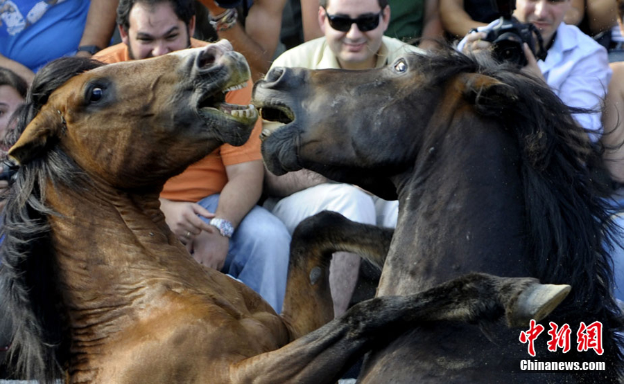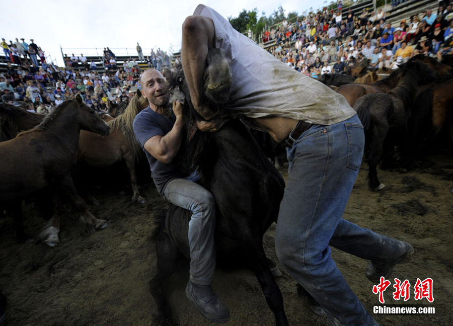 當地時間7月3日,西班牙薩武塞多,年輕人在傳統的“捕野馬節”上馴服野馬。作為古老的加利西亞節日,捕野馬節可以追溯到青銅時代的馴獸練習。