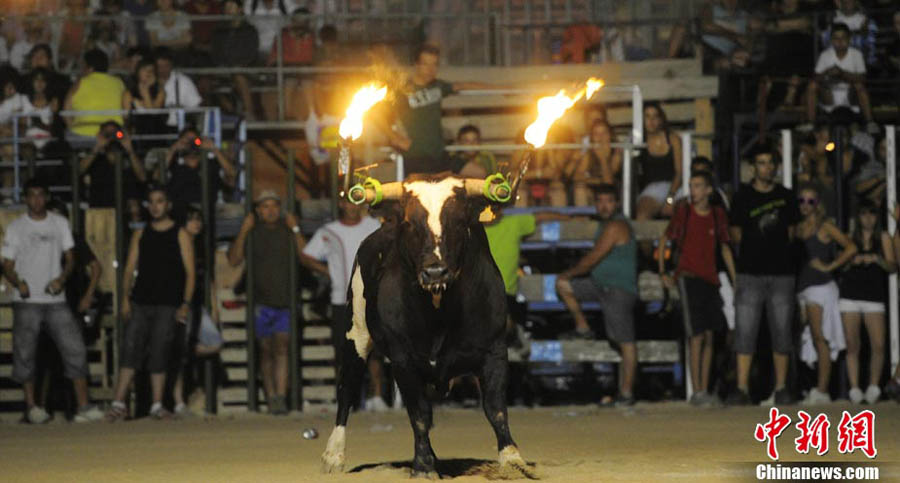 近日,在西班牙安波斯塔市,舉行“奔火牛”活動。“奔火牛”是西班牙東部地區的傳統節日慶典活動。在活動中,公牛的犄角被綁上火把滿場飛奔,場面驚險刺激。
