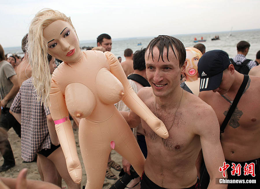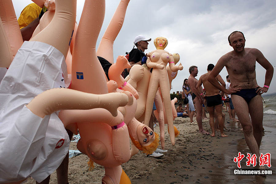 俄羅斯搞笑游泳比賽懷抱“充氣娃娃”游泳