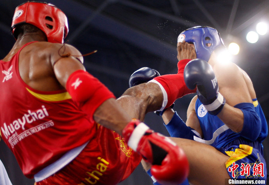 8月31日,2010年北京首屆世界武搏運動會空手道項目在北京科技大學體育館展開首日爭奪。圖為在一場比賽中,中國隊許祥伍被伊朗選手法羅希(Farrokhi)擊中面部。