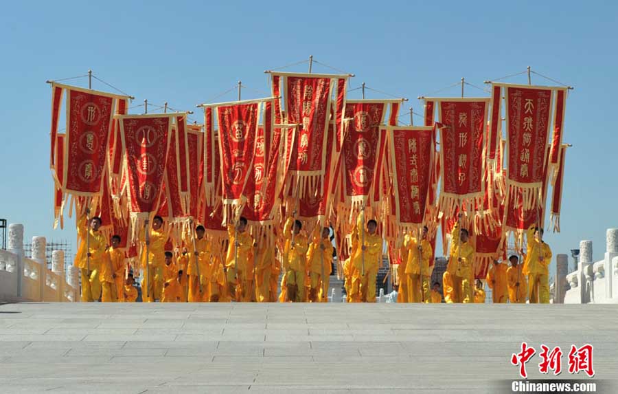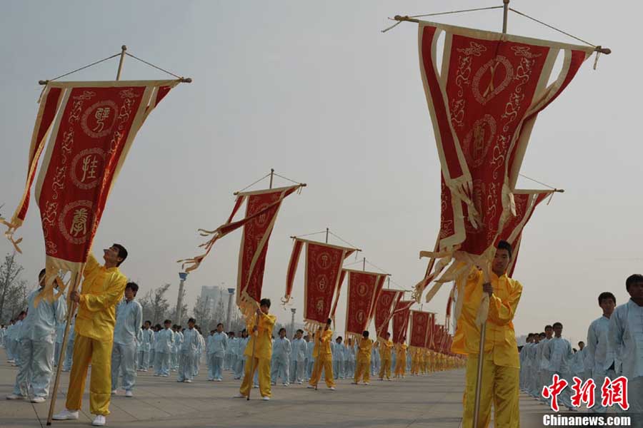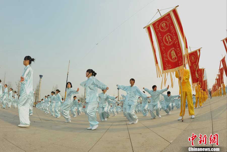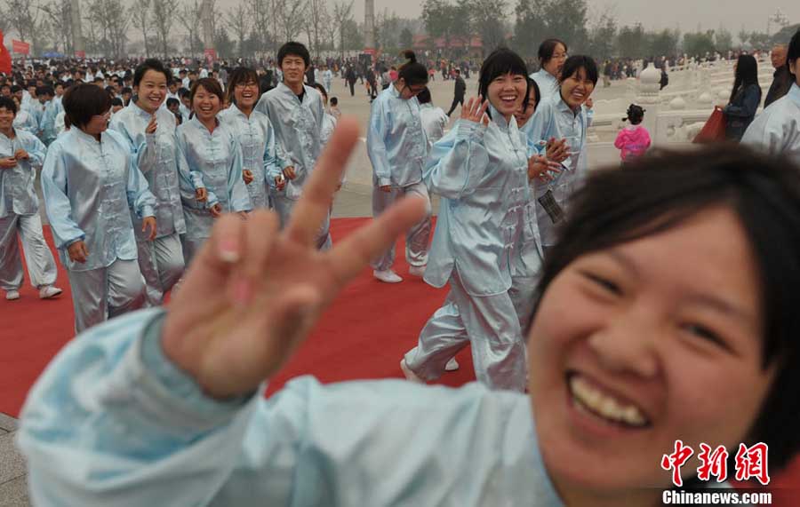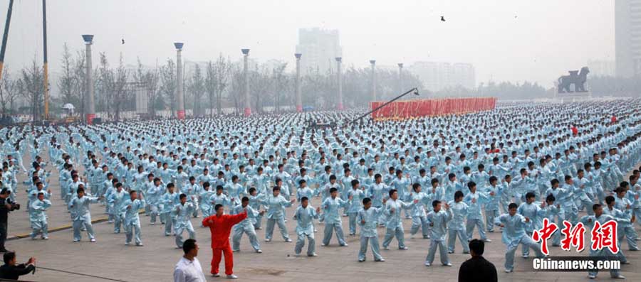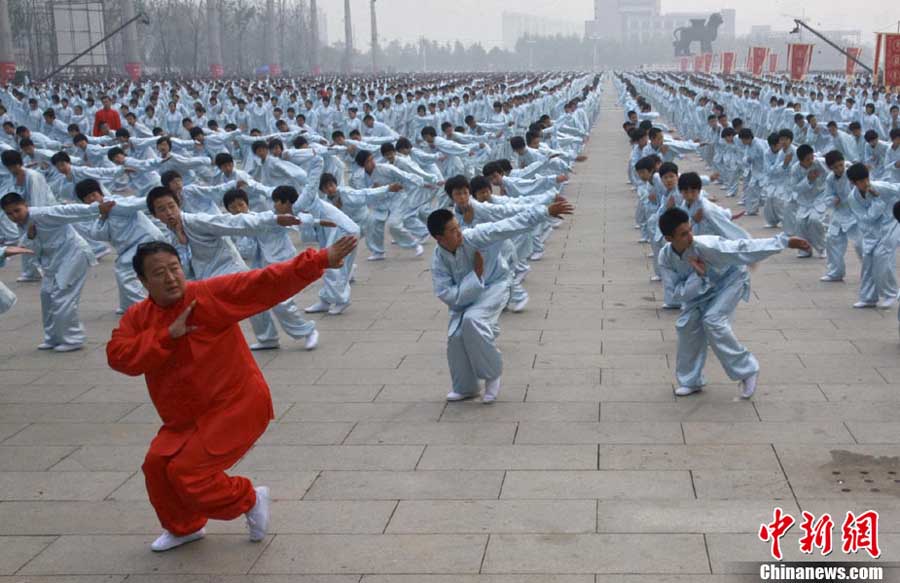10月10日,中國“武術(shù)之鄉(xiāng)”滄州獅城公園廣場“拳濤”滾滾、武健泱泱,1.5萬人同習(xí)53個拳種,創(chuàng)造了《中國武術(shù)拳種同時展演數(shù)量之最》吉尼斯紀(jì)錄,上海大世界吉尼斯總部現(xiàn)場認(rèn)證。圖為萬人習(xí)武現(xiàn)場。