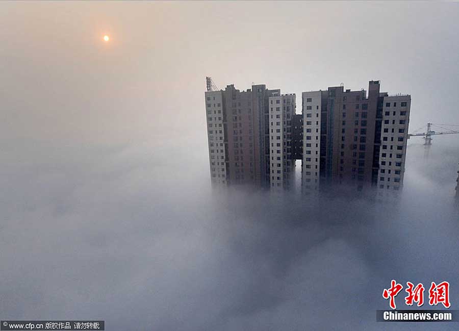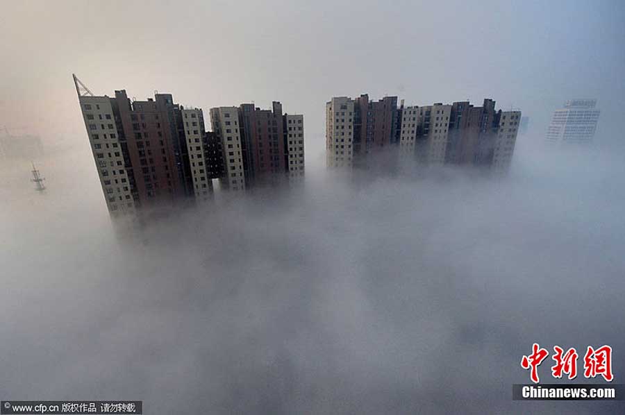 10月9日早上6點(diǎn)多,一場(chǎng)罕見的“平流霧”襲擊合肥。合肥城市的建筑掩映在濃霧中異常壯觀。