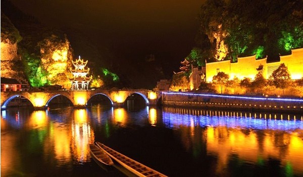 若是有興致,大可登船夜游,參與游船文藝演出,聽苗家土歌,看被燈光渲染得光怪陸離的水面,和兩岸飄忽的人聲燈影,切身領略現代聲光與古鎮原生態文化交相融合的精美畫面,感受天水相連,火樹銀花不夜天的華麗場面。