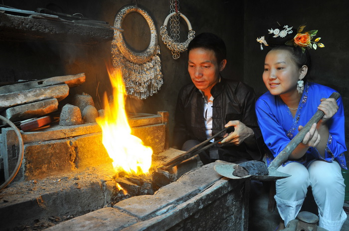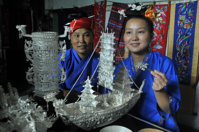 據(jù)黔東南政府網(wǎng)消息 苗族女銀匠吳秀春是貴州省臺(tái)江縣施洞鎮(zhèn)塘壩村塘壩組村民,當(dāng)?shù)刂缱邈y匠傳承人吳水根大女兒,芳齡二十二周歲,從小心靈手巧,勤學(xué)愛(ài)動(dòng),8歲起跟隨其父親學(xué)習(xí)銀匠手藝,手藝超群出眾,一朵美麗的山菊花在山村綻放。親手所制作的吉祥鳥(niǎo)、龍頭釵、龍鳳飛舞、一帆風(fēng)順船艇等銀飾工藝品栩栩如生,分別獲省、州、縣獎(jiǎng)牌。同時(shí)在母親刺繡手藝的影響熏陶下,吳秀春不僅成為貴州省目前最年輕最美麗女銀匠傳承人,也是威震一方的刺繡能手。