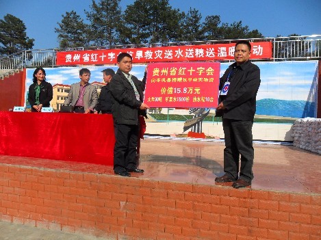 據(jù)黔東南政府網(wǎng)消息 2010年4月8日,省州紅十字會抗旱救災捐贈儀式在岑鞏縣天星鄉(xiāng)舉行,省紅十字會副秘書長朱正群、州紅十字會副會長晏志、岑鞏縣人民政府副縣長王文云出席了捐贈儀式。
