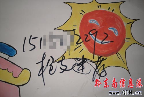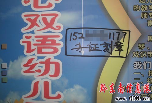 但在昨日,記者又看到無數(shù)非法野廣告一夜之間如雨后春筍般地涂滿了縣城各大街小巷醒目位置,并挺進了純潔寧靜怏怏學子的教育凈地——校園。內(nèi)容包括:“貸款、辦證刻章、槍支迷藥”等,這些觸目驚心詞語幾乎無孔不入,甚至連幼兒園都未能幸免,其囂張程度、明目張膽一目了然。