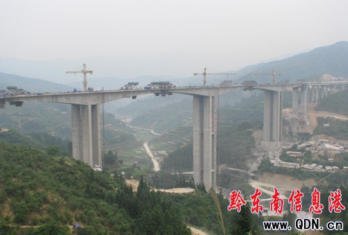 據(jù)項(xiàng)目總工程師劉萬(wàn)林介紹,廈蓉AT5標(biāo)段位于黎平縣肇興侗寨。線(xiàn)路全長(zhǎng)4.85KM。工程包括肇興分離式特長(zhǎng)隧道4752米,肇興大橋全長(zhǎng)845米和一座小橋。薄壁空心高墩及150米大跨連續(xù)剛構(gòu)施工是本橋的重難點(diǎn)。目前,AT5標(biāo)段已完成工程建設(shè)投資3.8億元,占工程總投資的84%。圖為剛合攏的肇興大橋。