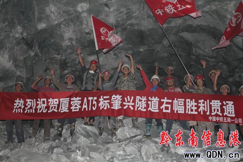 本港訊 (特約記者 陸書(shū)明 攝影報(bào)道)10月5日19:28,由中鐵五局一公司和中鐵十六局共同承建的黎平縣肇興隧道右幅順利實(shí)現(xiàn)貫通。它標(biāo)志著貴州公路第一長(zhǎng)大隧道的順利建成。此時(shí),經(jīng)過(guò)兩年多來(lái)晝夜鏖戰(zhàn)在這座貴州公路隧道之最的兩家建設(shè)單位的建設(shè)者們激動(dòng)的擁抱在一起,歡呼著這勝利會(huì)師時(shí)刻的到來(lái)。
