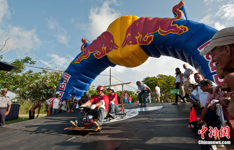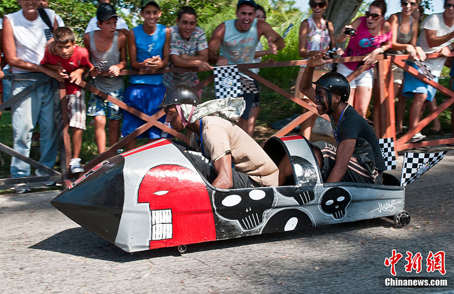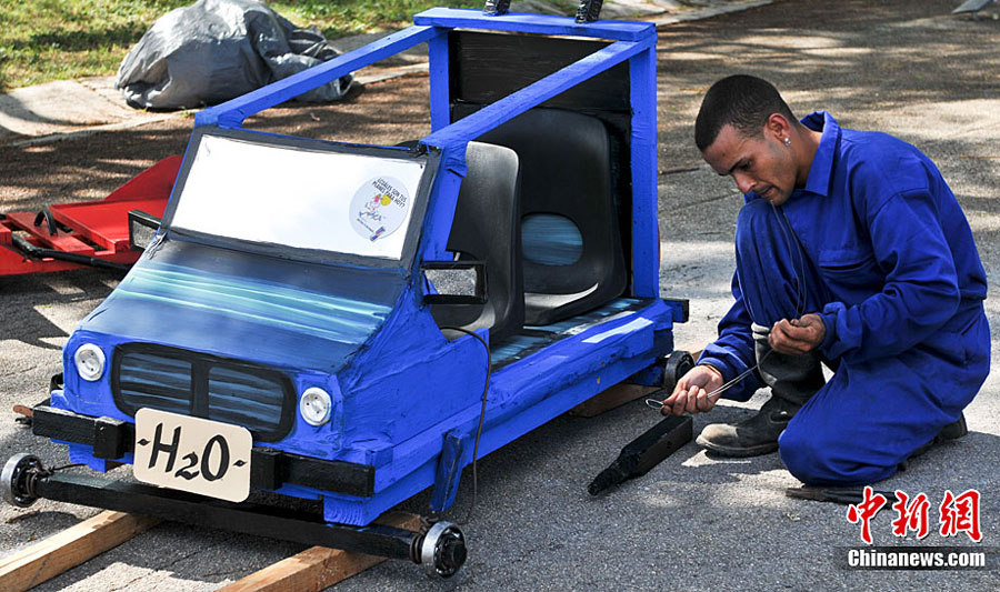 當?shù)貢r間8月27日,古巴首都哈瓦那舉行了首屆無動力自制小車大賽。82名參賽選手駕駛著41輛自制小車參賽。