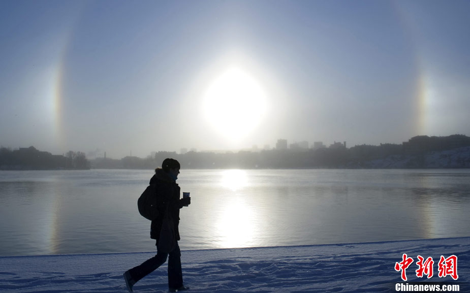 11月30日,瑞典斯德哥爾摩,梅拉倫湖上空出現幻日現象。幻日現象是一種罕見的光暈現象,日光在大氣層中的冰微粒上發生反射、折射和衍射就可能產生幻日。