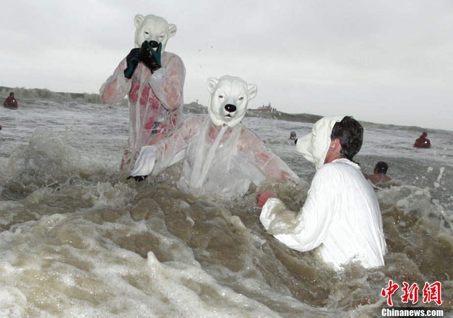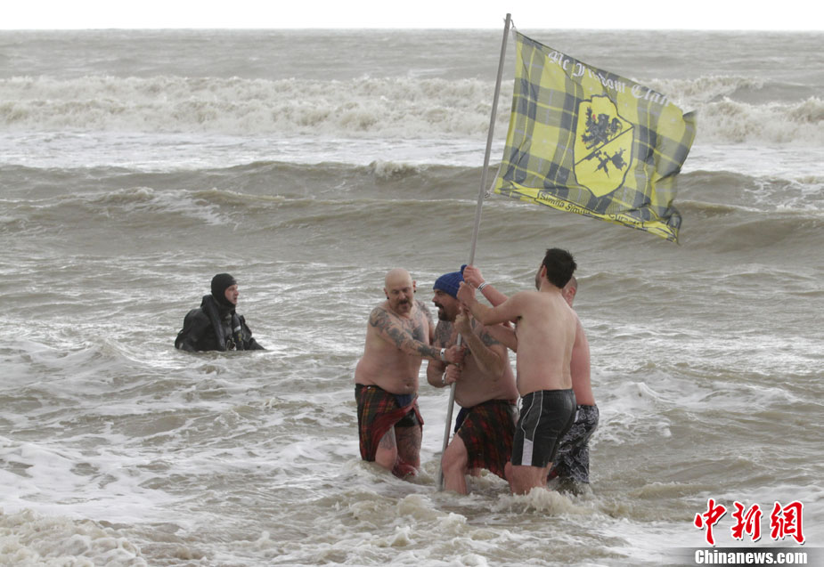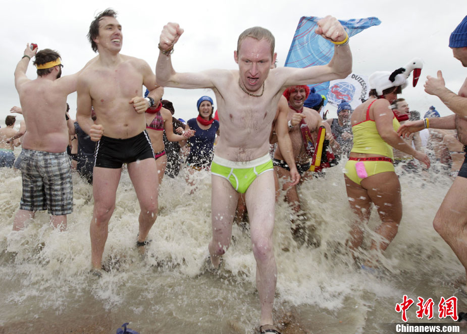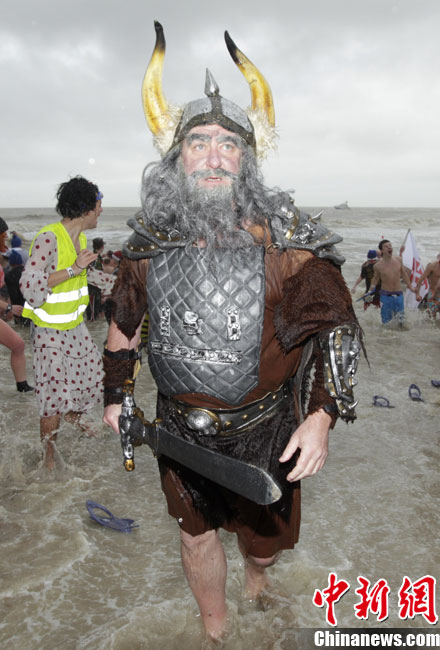 1月8日,在比利時海邊城市,六千名勇敢者跳進只有10℃的海水中參加一年一度的趕海活動。