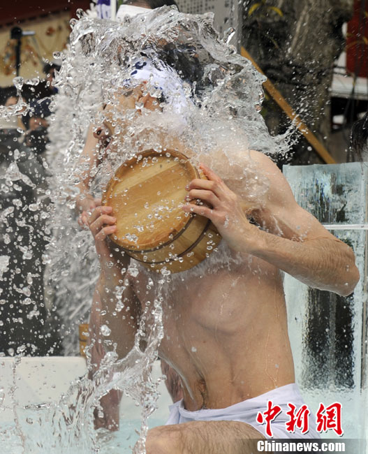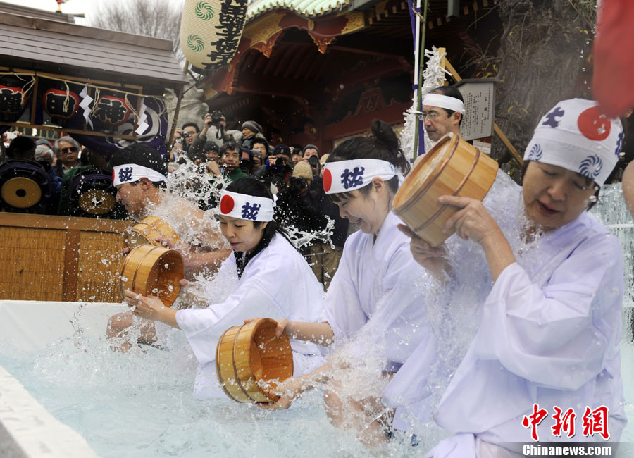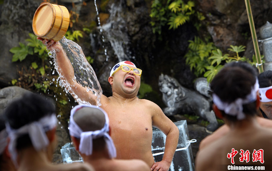 近日,在日本東京,民眾們在廟宇內(nèi)用冰水沖洗身體迎接新年。