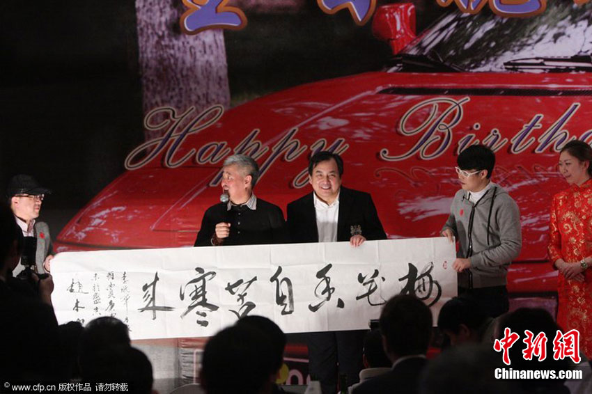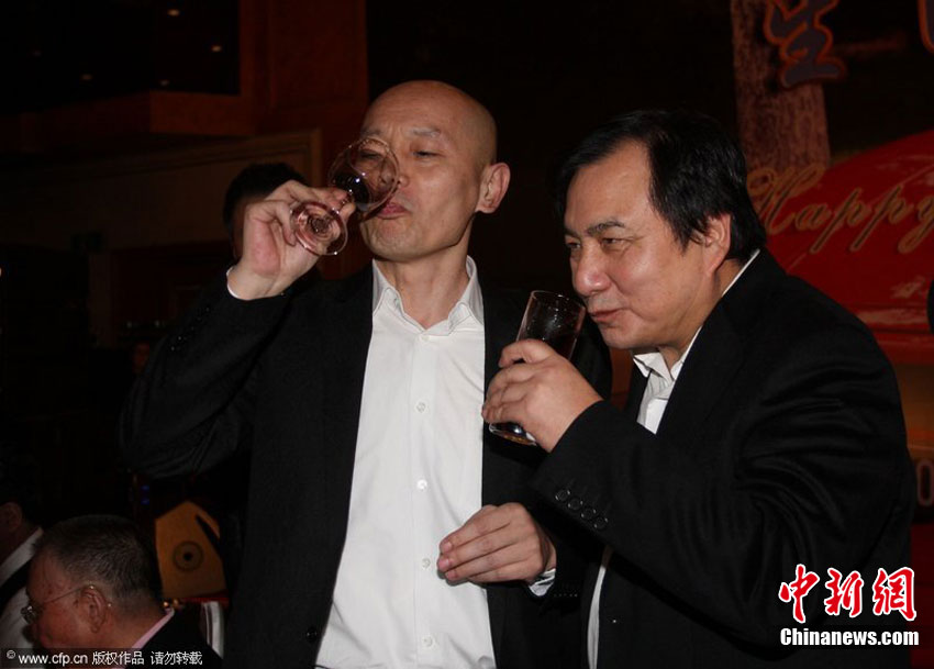 亞洲第一位擁有勞斯萊斯的大富翁李曉華19日在北京昆侖飯店大擺六十歲生日宴。姜昆現場表演即將在春晚演出的相聲。小沈陽滿場飛異常活躍。當晚葛優(yōu)與壽星李曉華和趙本山豪飲碰杯。圖為趙本山和李曉華、葛優(yōu)碰杯豪飲。