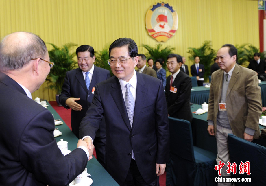 3月4日,中國“兩會”進入第二天。全國政協十一屆四次會議小組討論,審議全國政協常委會工作報告和提案工作情況報告。黨和國家領導人胡錦濤、吳邦國、賈慶林、李長春、習近平、李克強、賀國強、周永康,分別看望出席全國政協十一屆四次會議的委員并參加分組討論,共商國是。圖為中國國家主席胡錦濤、全國政協主席賈慶林來到全國政協農工黨、九三學社界委員聯組討論現場,與委員們共商國是。
