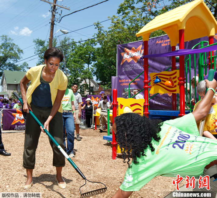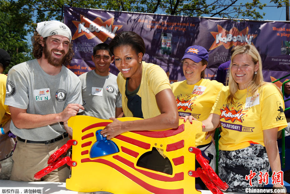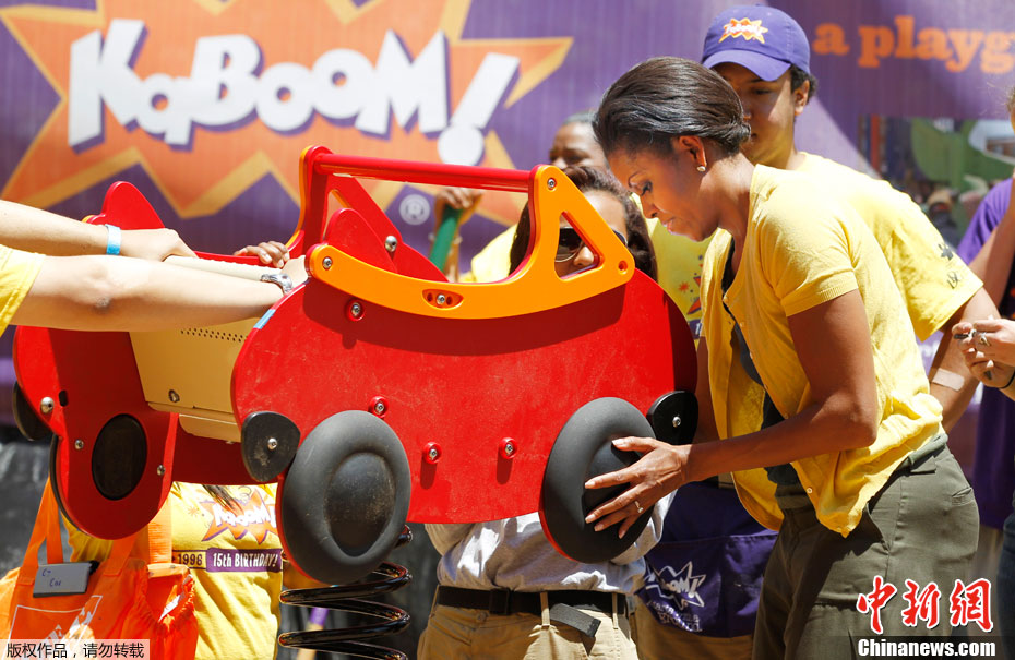 2011年6月15日,美國華盛頓特區(qū),美國總統(tǒng)夫人米歇爾·奧巴馬與志愿者在一所公立小學(xué)協(xié)助修建操場。米歇爾心情大好,甚至蕩起了秋千。