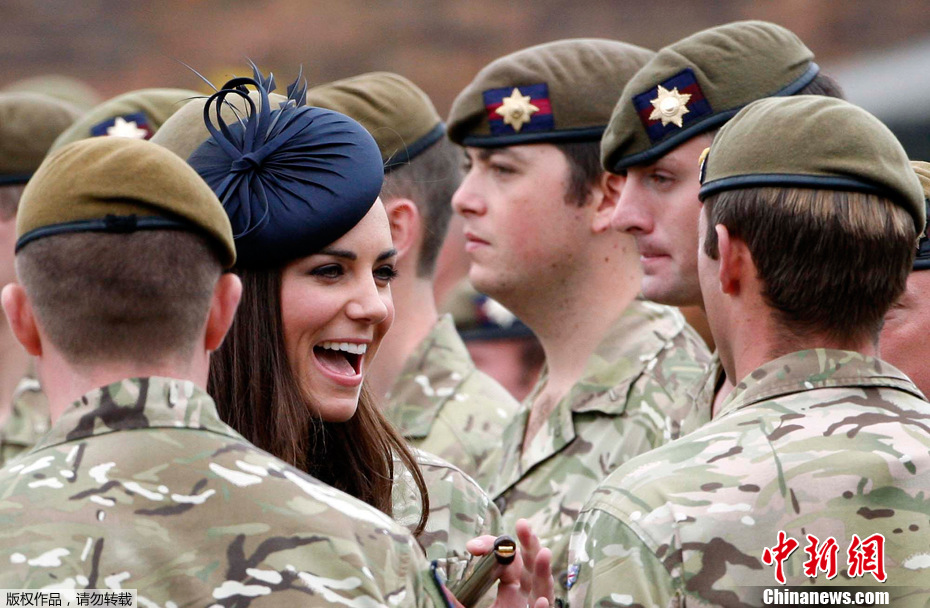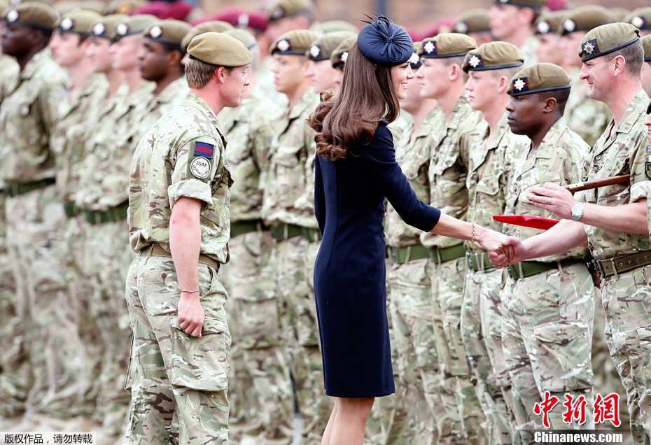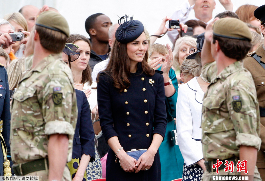 2011年6月25日,英國溫莎,一身深藍色軍禮服裝扮的凱特是首次以王室成員身份向剛從阿富汗歸國的英國愛爾蘭衛隊士兵頒發作戰勛章。英國王室一位助手透露,凱特很高興能和丈夫一起出席這次活動。