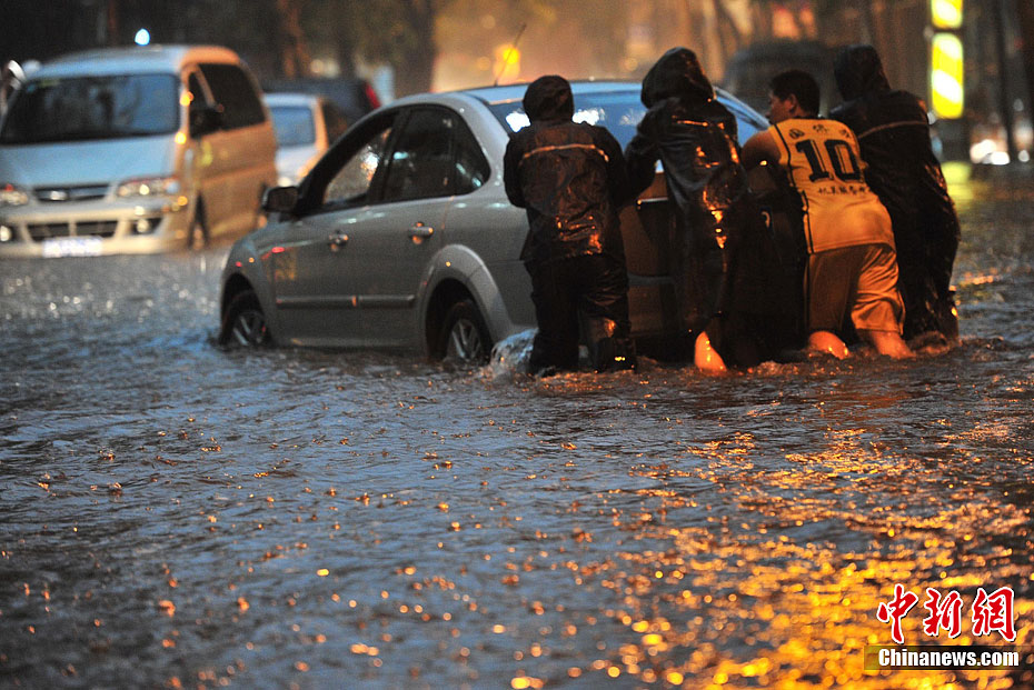 8月9日,北京,暴雨伴隨雷暴襲擊北京市區,造成大量降雨。圖為北京北部地區五道口路段的行人車輛在雨中行進。圖片來源:CFP視覺中國