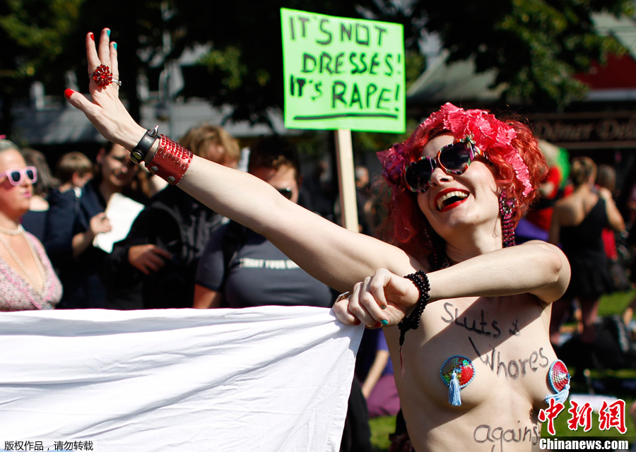 8月13日,德國柏林,穿著暴漏的女子參加“蕩婦游行”抗議對女性性虐待。該活動已在全球數(shù)個城市展開。