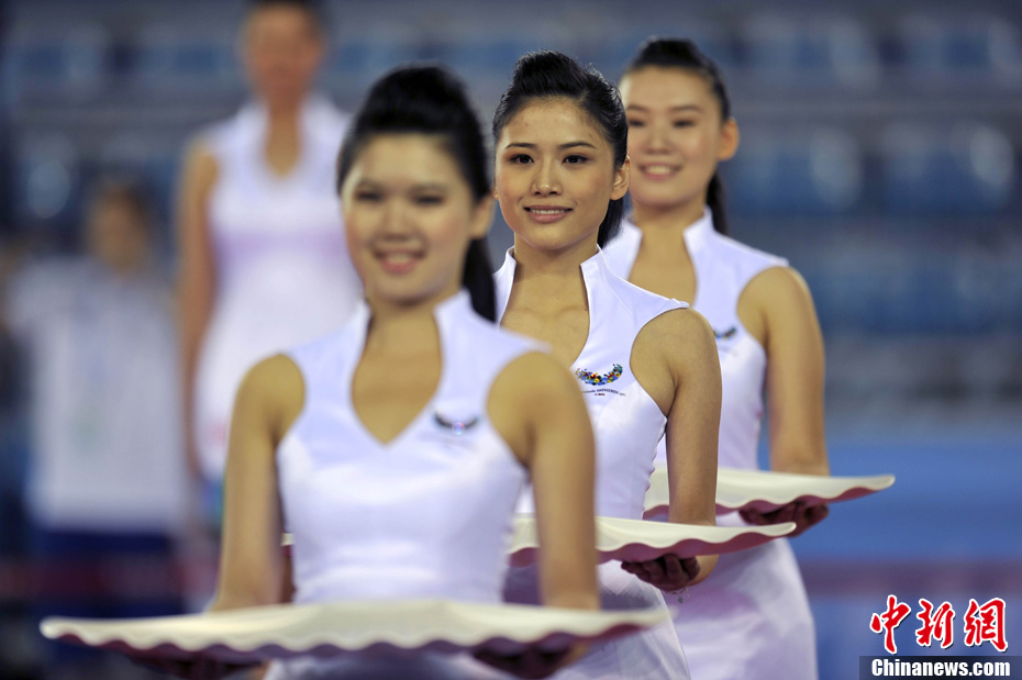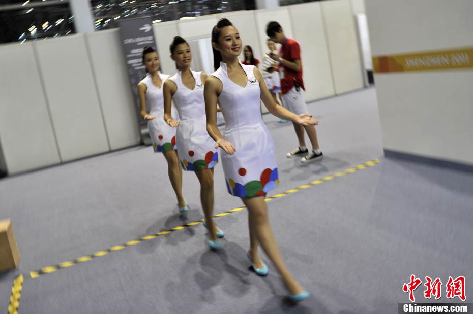 禮儀小姐是深圳大運會頒獎儀式上一道靚麗的風景線。圖為8月13日禮儀小姐們在比賽間隙刻苦訓練。中新社發 金碩 攝